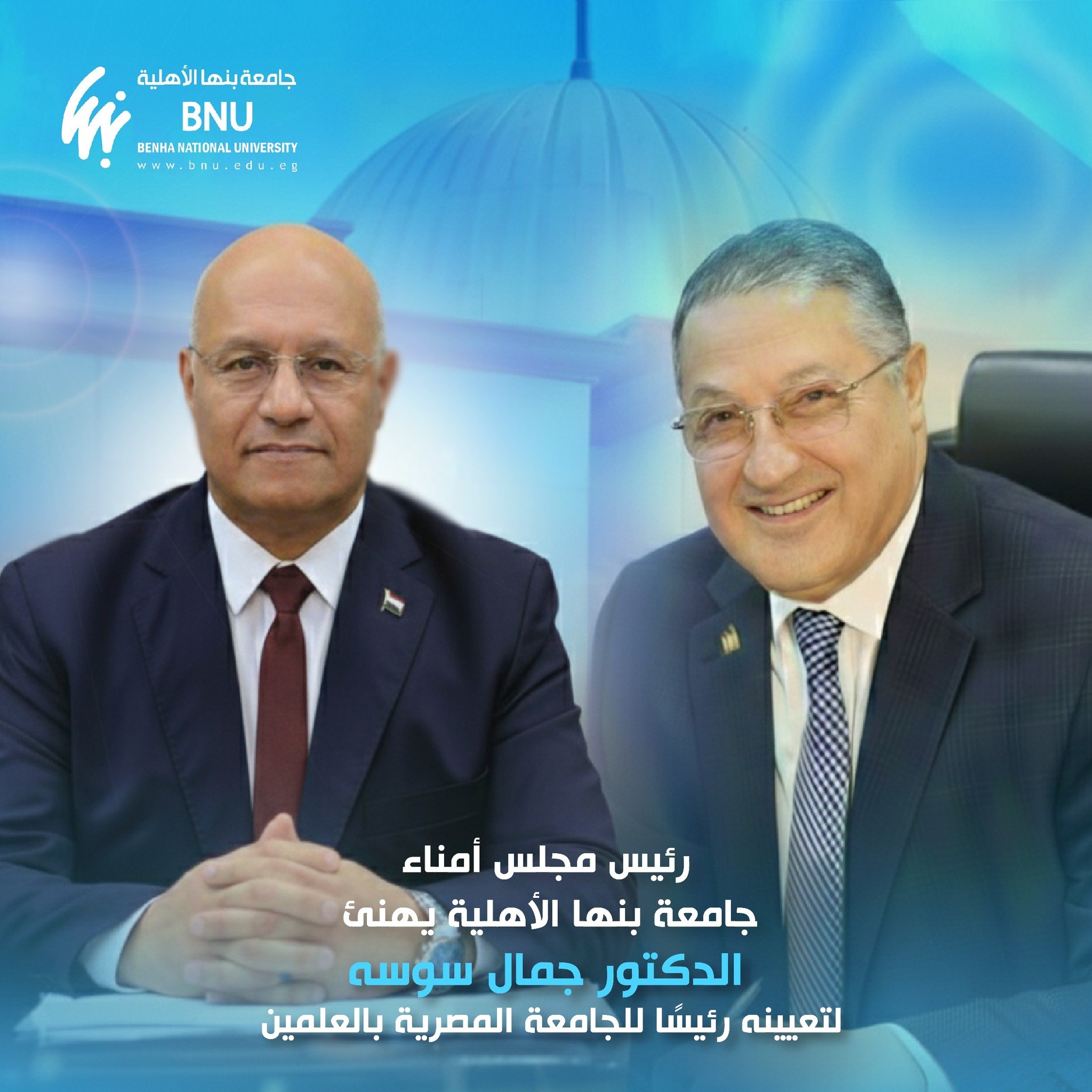 يتقدّم الأستاذ الدكتور جمال السعيد، رئيس مجلس أمناء جامعة بنها الأهلية، والدكتورة سهير شعراوي، نائب رئيس مجلس الأمناء، نيابةً عن مجلس الأمناء، والدكتور تامر سمير رئيس الجامعة بخالص التهاني وأصدق التبريكات إلى الأستاذ الدكتور جمال سوسه، عضو مجلس أمناء جامعة بنها الأهلية،ورئيس لجنة قطاع الطب البيطري بالمجلس الأعلى للجامعات بمناسبة صدور قرار تعيينه رئيسًا للجامعة المصرية بالعلمين.